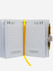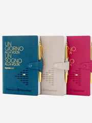 Per essere sempre pronti a scrivere al volo, l'agenda possiede un passante portapenne ed è venduta abbinata ad un'elegante biro oro a scatto.