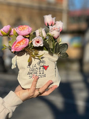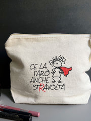 - Busta in cotone con chiusura a zip, decorata con grafica “Ce la farò anche stRavolta”